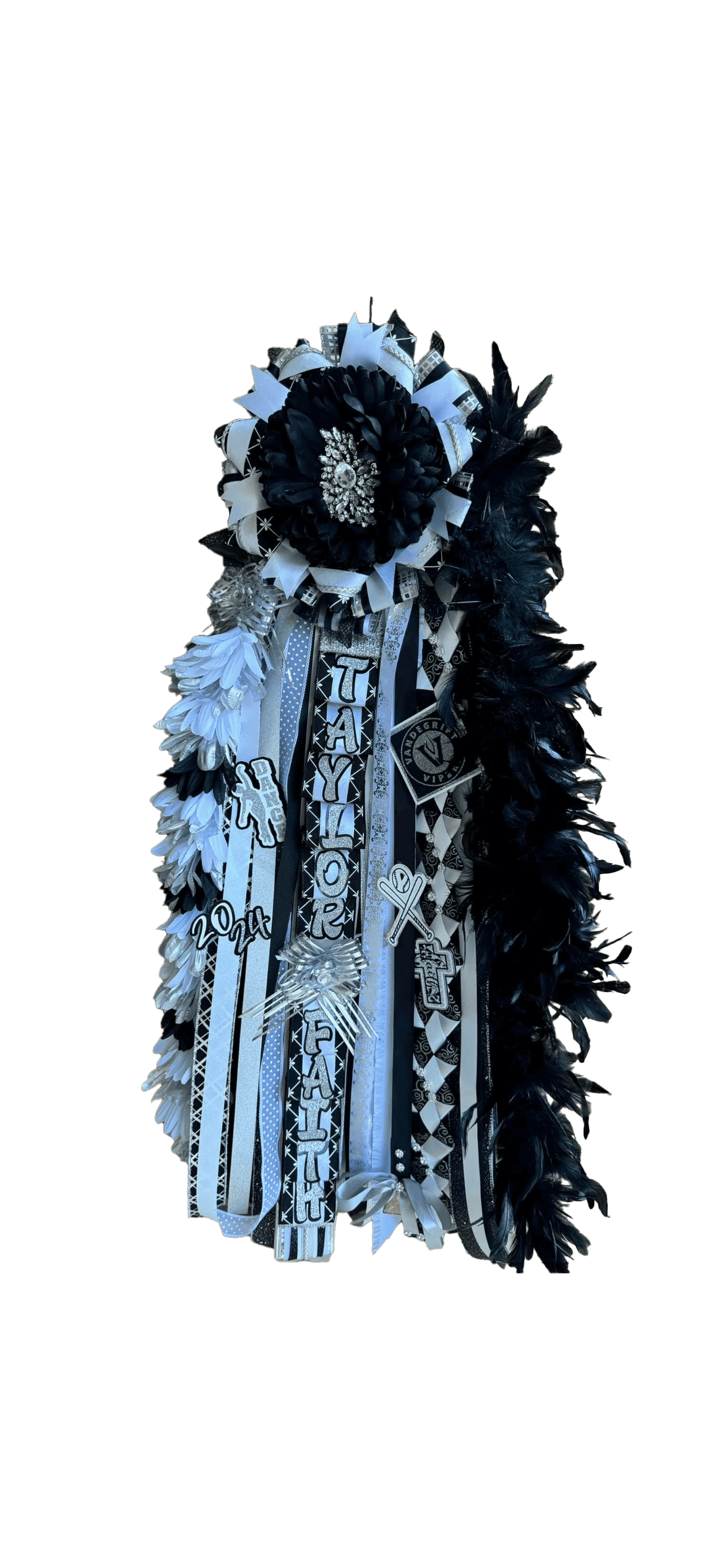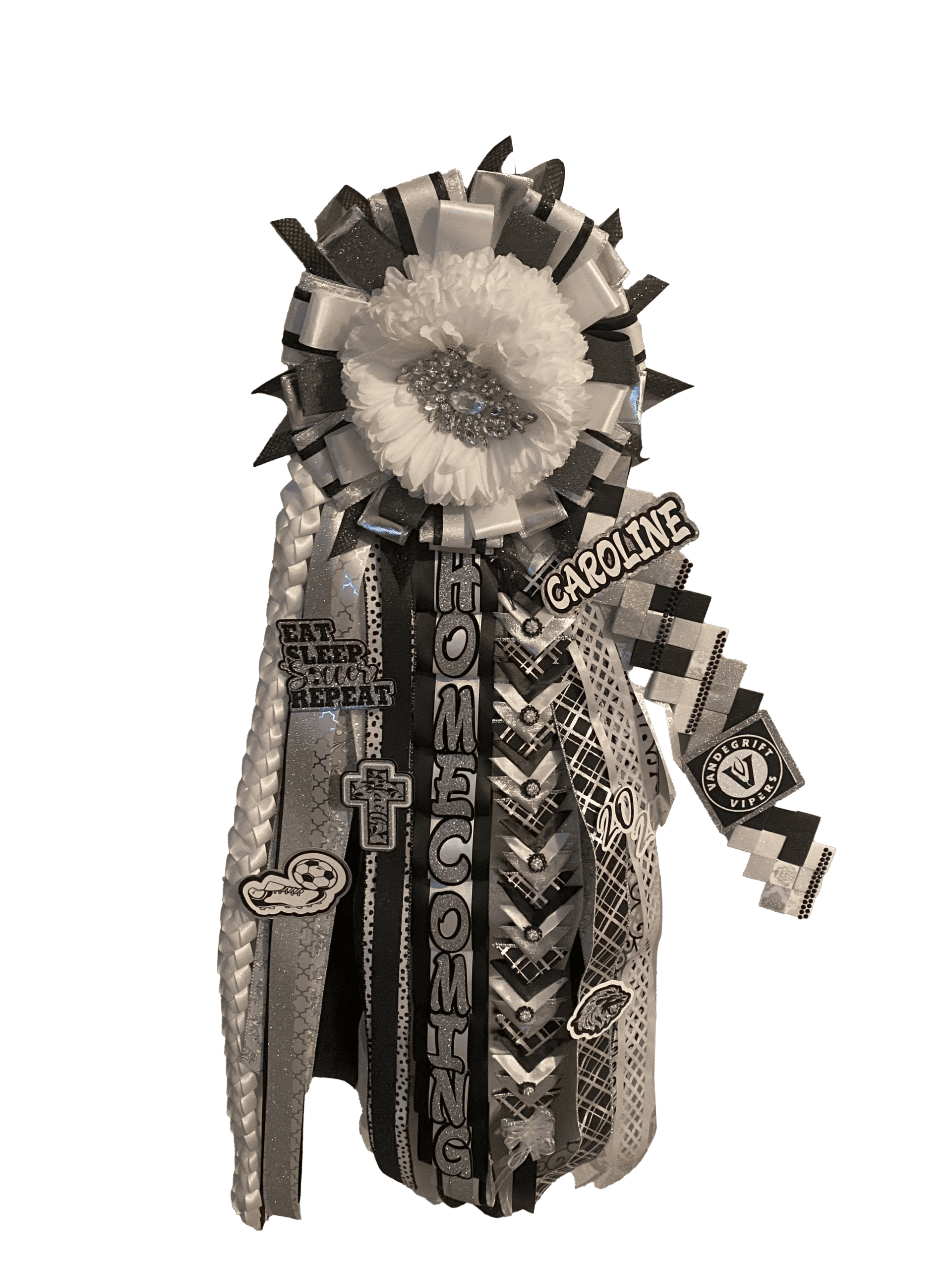 Obsessed with Caroline’s 2024 mum! 🖤🤍 Hannah nailed every detail — sparkle, school pride, and perfect personalization. ✨ #HomecomingMum #CustomMade #Hoco2024